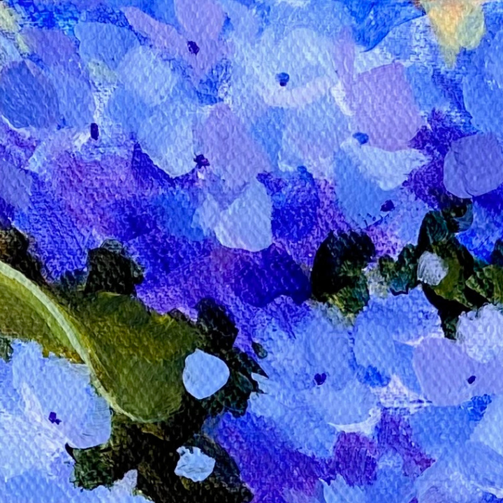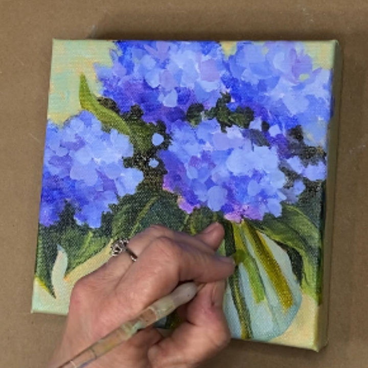 Painting blue hydrangeas in a rounded glass vase offers numerous benefits to your artistic practice. By showcasing the rich mixtures of blues and blue violets, you can effectively convey depth and luminosity within your artwork. The varying shades of blue allow you to capture the play of light and shadow, creating a sense of three-dimensionality that adds visual interest to the composition. Furthermore, incorporating the rich jewel tones of the stems and glass vase not only provides a complementary contrast to the blues but also adds visual interest and vibrancy to the overall painting. Additionally, by employing a light touch when painting the background, you allow the underpainting to show through, adding layers of intrigue and dimension to the artwork. The careful selection and execution of background colors contribute to the overall visual narrative of the piece, emphasizing the beauty and uniqueness of the blue hydrangeas in the glass vase. I hope you'll enjoy painting this loose style hydrangea painting and all it's unique characteristics in range of colors.