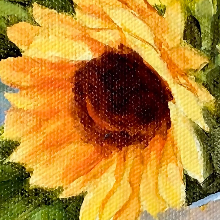 Painting yellow sunflowers in a luminous white pitcher against a gray-blue background offers a range of benefits to your artistic composition. By painting the sunflowers from lights to darks, with a brilliant yellow underpainting, you can effectively capture the luminous quality of light that shines through the flowers and pitcher. This technique allows the vibrant yellow hues to shine through, enhancing the overall radiance and vitality of the sunflowers. Similarly, by building up light coats of grays to white on the pitcher, you can create a sense of form and light, adding depth and dimension to the artwork. The subtle variations in shading and highlights on the pitcher contribute to its realistic and three-dimensional appearance. The choice of a blue-gray background serves to complement the rich yellow-orange tones of the sunflowers, creating a harmonious color scheme. This background also provides a strong contrast to the delicate white pitcher, further emphasizing its presence and adding visual interest to the composition. I hope you will enjoy painting this small painting pure of sunshine and happiness!